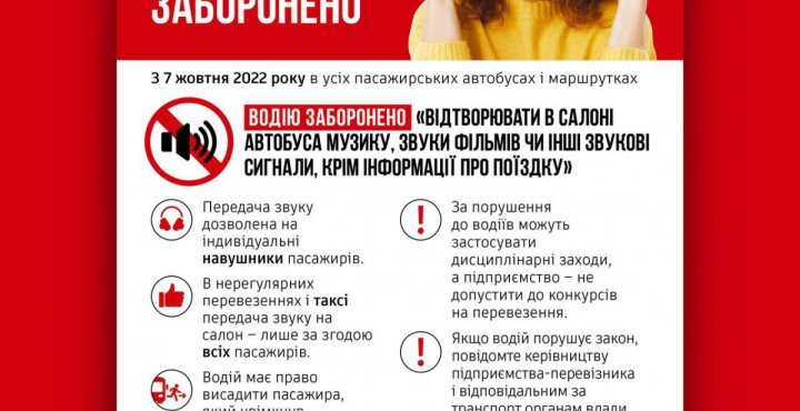 “Водіям рейсових пасажирських автобусів та маршруток заборонено “відтворювати в салоні автобуса музику, звуки фільмів чи інші звукові сигнали, крім інформації про поїздку”, – ідеться у повідомленні.