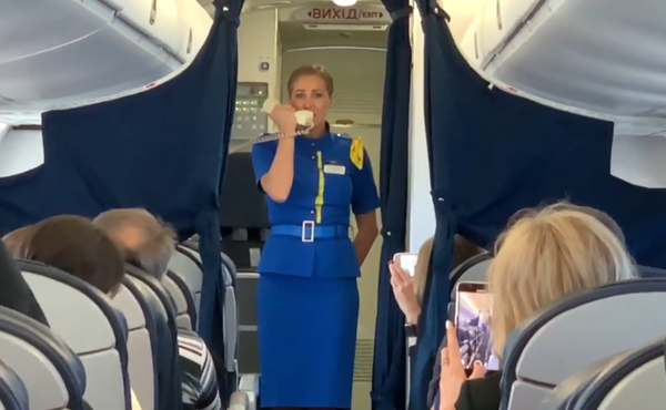 Співробітники авіакомпанії просили, не дивлячись на урочистість моменту, не вставати зі своїх місць під час виконання гімну.
