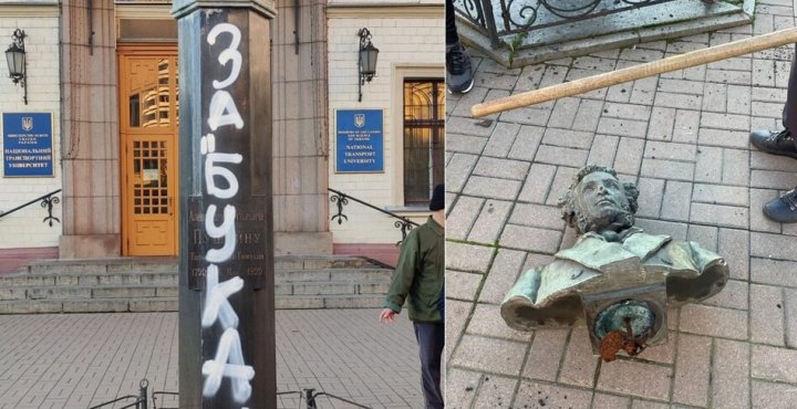 У жовтні Києві активісти самовільно знесли погруддя Пушкіна біля Національного транспортного університету. Як повідомила всеукраїнська спільнота «Декомунізація.Україна», цю акцію було присвячено лейтенанту Збройних сил України Денису Антипову на псевдо Бук – активісту, викладачу корейської мови Київського національного університету ім. Шевченка, який загинув у травні 2022 року, у бою з російськими окупантами.