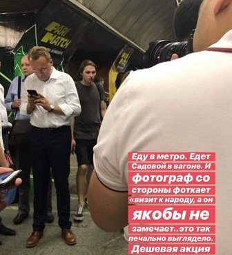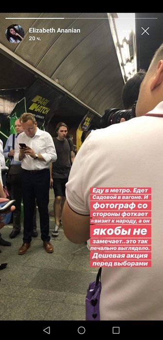 Про це пишуть користувачі соціальних мереж. “Їду в метро. Їде Садовій у вагоні. І фотограф з боку фотографує “візит до народу”, а він нібито не помічає. Це так сумно виглядало. Дешева акція перед виборами”, – повідомляє користувач Elizabeth Ananian у своїй історії на Facebook.