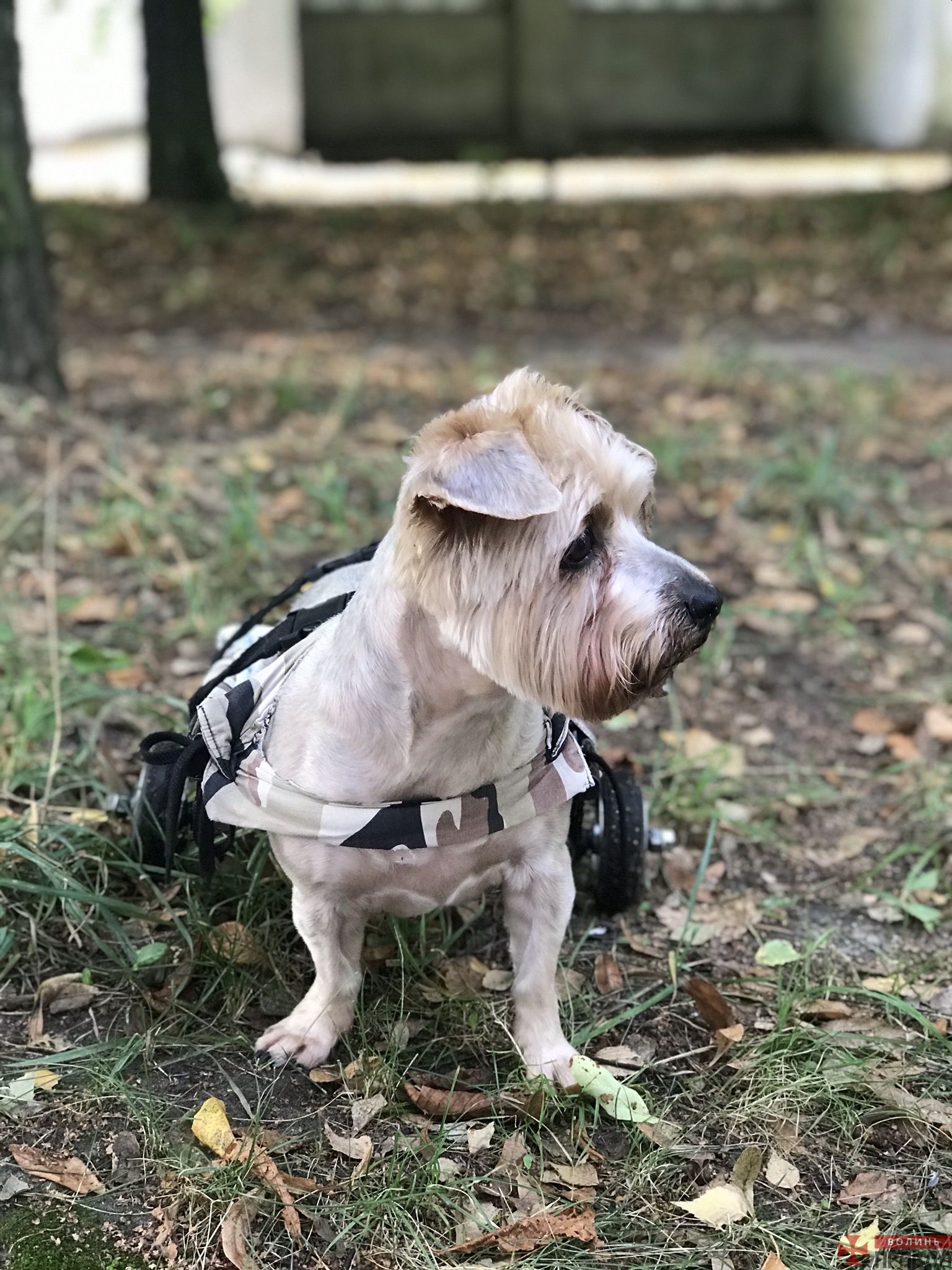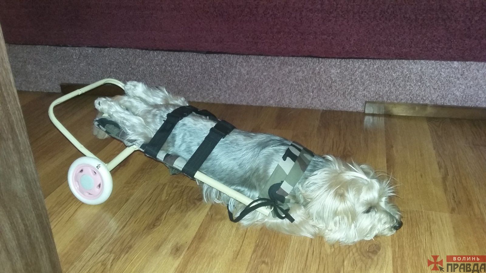 Першу коляску для йорка вони зробили із іграшкової. Жінка розповідає, що у місті немає зручних умов, як для людей з інвалідністю, так і для тварин. У багатьох приміщеннях немає пандусів, і тоді вона носить Гуччі на руках. Пес дуже дружелюбний і добрий, грається з пташками, котиками.