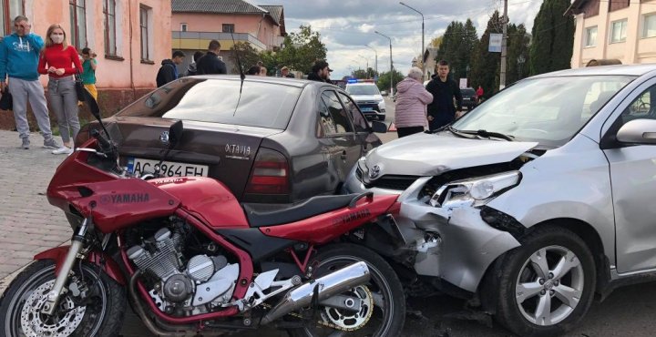 Водійка Тойоти, виїжджаючи з другорядної вулиці на головну, не надавала перевагу в русі мотоциклу, який їхав в сторону автостанції. Потім сталося зіткнення з припаркованою Шкодою.