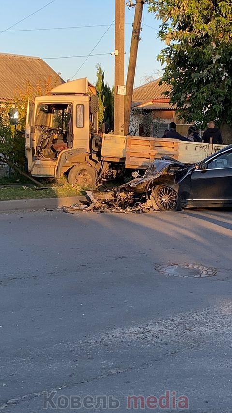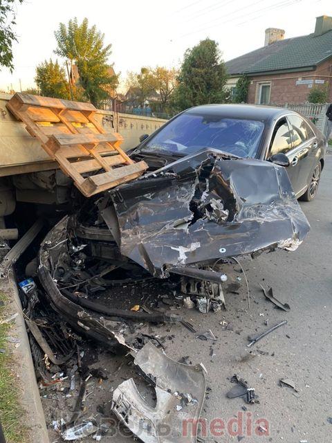 Ймовірно, легковик Mercedes на швидкості втаранився у вантажівку, яку в результаті відкинуло на тротуар.