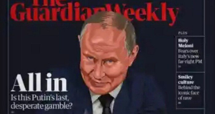 Британська газета Guardian Weekly у випуску від 30 вересня розмістила на обкладинці російського диктатора Володимира Путіна. На зображенні господар Кремля зображений з ігровими фішками. Також є підпис: «Путін іде ва-банк».