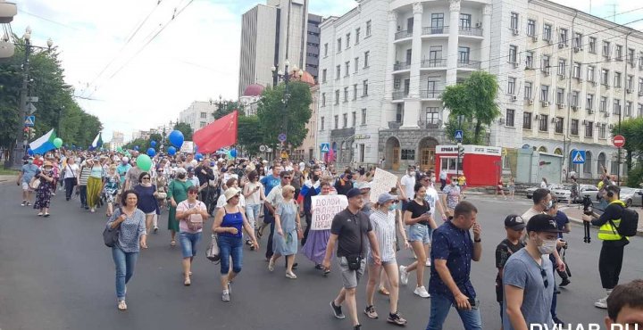 Росіяни-протестувальники вийшли на центральні вулиці Хабаровська – Тургенєва, Муравйова-Амурського і центральну площу Леніна. За даними видання, в акції протесту беруть участь кілька десятків тисяч осіб, що приблизно на третину більше, ніж під час попередніх суботніх акцій, 18 і 11 липня, які були названі наймасовішими в історії Хабаровська.