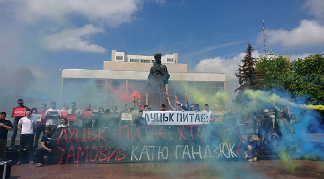 Активісти розгорнули банери з написом «Хто замовив Катю Гандзюк?» та запалили фаєри і димові шашки. Акція завершилася гімном України.