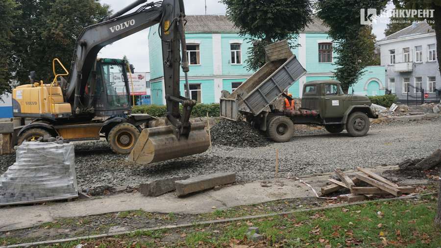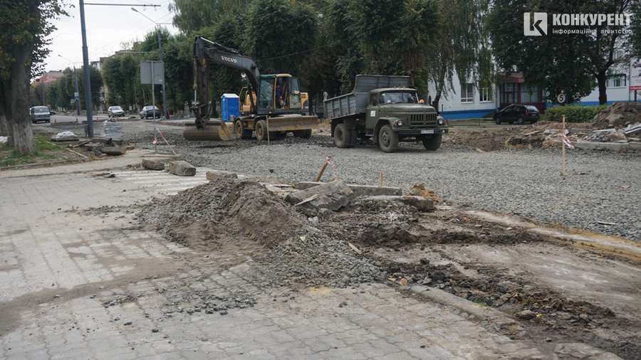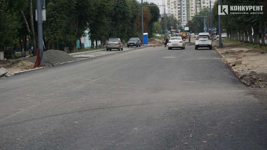 Біля Київського майдану продовжує працювати важка техніка, тут ще не виклали асфальт. Ближче до центру міста асфальтне полотно вже готове, тож рух проспектом частково відновлений.