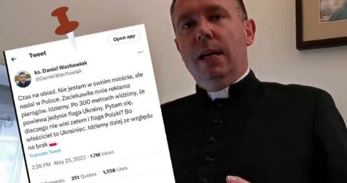 «Настав час обіду. Я не у своєму місті, але все ще в Польщі. Мене заінтригувала реклама вареників. Йду. Через 300 метрів бачу, що майорить лише прапор України. Я запитую себе, чому не майорить польський прапор? Тому що власник українець», – написав він. Священник додав, що через відсутність польського прапора відмовився заходити до приміщення.