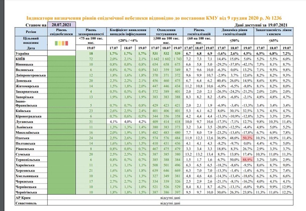 Обидва регіони як і раніше перебувають в зеленій зоні, хоча рівень госпіталізацій з COVID-19 там відповідає червоній. Одеська та Тернопільська області не відповідають зеленій зоні епідемічної небезпеки за показником динаміки госпіталізацій. Про це повідомляє прес-служба Міністерства охорони здоров’я у вівторок, 20 липня.