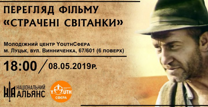 У день пам’яті та примирення у всіх країнах Європи та світу згадуються історичні події, що назавжди залишили свій слід у долях десятків народів та наслідки яких ще довго впливали і на українську націю. Саме цього дня наш молодіжний центр разом із ГО «ВМР «Національний Альянс» організувує показ фільму Григорія Кохана «Страчені світанки». Фільм розповідає про період окупації Західної України більшовиками, про долю воїнів УПА та їхніх родин. Окупанти та їхні прибічники жорстоко придушують українську людність, але боротьба у нерівних силах триває.