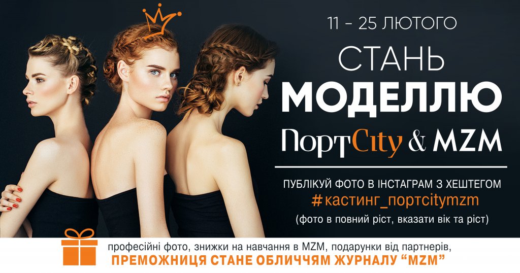 Торгово-розважальний центр ПортCity та модельна студія MZM запрошують на кастинг. Для того, аби пройти безкоштовне дводенне навчання від професійних моделей, фотографів, стилістів, візажистів та дієтологів потрібно лише опублікувати власне фото у повний зріст в інстаграмі з хештегом #кастинг_портсitymzm до 25 лютого, вказати вік та зріст.