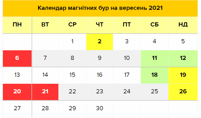 У вересні 2021 року очікуються магнітні бурі, які будуть істотно відчутні в Україні та світі. Одна з магнітних бур буде досить потужною, тож матиме вплив на самопочуття метеочутливих людей. Бурі варто очікувати впродовж всього місяця. Триватимуть магнітні бурі по кілька днів.