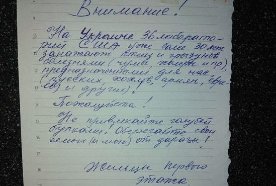У ньому звертаються до мешканців під’їзду і всіх сусідів з проханням припинити підгодовувати голубів, адже американці заражають саме цих птахів надзвичайно небезпечними хворобами в українських біолабораторіях, щоб надалі ті вбивали росіян, євреїв та вірменів.