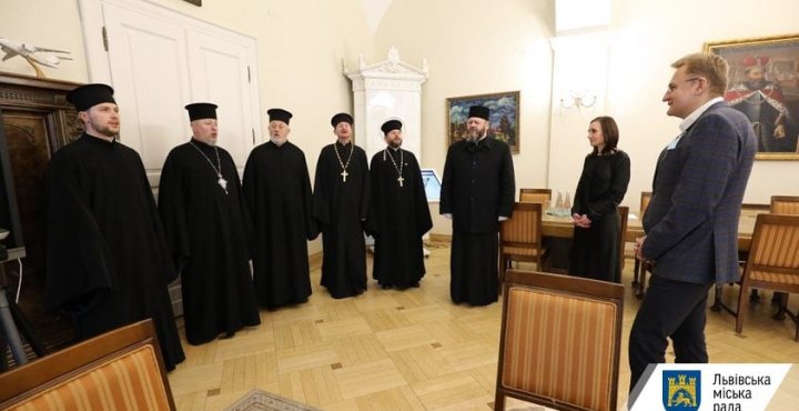 На запрошення міського голови Андрія Садового священнослужителі заколядували і привітали із різдвяними святами його та працівників міськради.