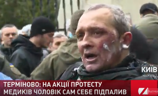 На вулиці Банковій у Києві під будівлею Офісу президента, де триває протест медиків, чоловік намагався вчинити самоспалення, трансляцію вів телеканал ZIK.