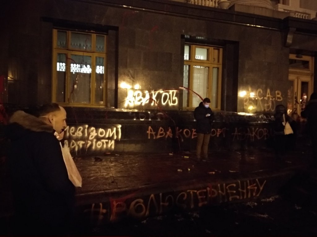 В сторону будівлі кидали піротехніку, на деяких вікнах утворилися тріщини. Врешті-решт вони підпалили табличку з написом “Президент України”.