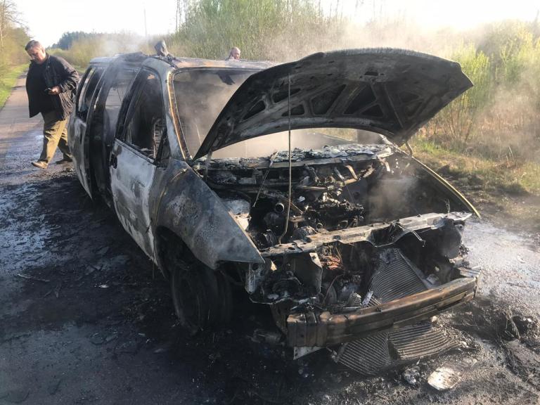 Та за кілька хвилин повернулися на іншому автомобілі. Один із лісопорушників у балаклаві, очевидно, намагаючись знищити докази, підпалив затриманий автомобіль.