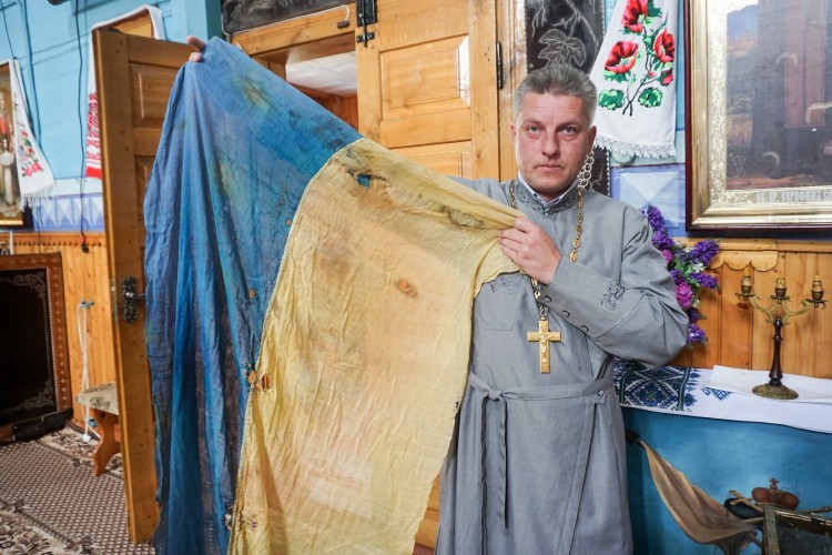 “Десять років тому перекривали церкву й майстри під бляхою знайшли якийсь пакунок, загорнутий в хустину. Коли розкрили, то побачили цей прапор та тризуб, — розповідає священик. — Скільки літ історичні реліквії там пролежали, нам не вдалося з’ясувати. Тому можемо лише здогадуватися. Навіть старожили не пам’ятають. Ніхто з жителів села не знає подробиць. Хоча мені доводилося чути різні версії. Казали, що прапор і тризуб зберігали в церкві ще до приходу перших совєтів у 1939- му”.