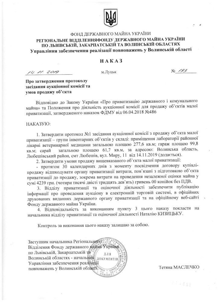 Замовником є Регіональне відділення Фонду державного майна України по Львівській, Закарпатській та Волинській областях.  Стартова ціна лоту становить 439 966.00 грн без ПДВ