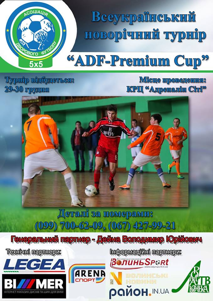 Асоціація дворового футболу 5х5 напередодні Нового Року проведе традиційний, престижний турнір “ADF-Premium Cup”, головна родзинка турніру, що матчі відбудуться на головній арені області, а саме на майданчику Арена Спорт, що знаходиться у КРЦ “Адреналін Сіті”. Про це повідомляє АДФ Волинь.