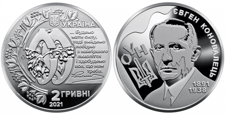 «Пам’ятна монета «Євген Коновалець» номіналом 2 гривні, продовжує серію «Видатні особистості України», вона присвячена військовому і політичному діячеві, особистості, що символізує спадковість української національно-визвольної боротьби, – Євгену Михайловичу Коновальцю… Монету виготовлено з нейзильберу, категорія якості карбування – «спеціальний анциркулейтед», маса – 12,8 г, діаметр – 31,0 мм, тираж – 35 000 штук. Гурт монети – рифлений», – сповіщає сайт НБУ.