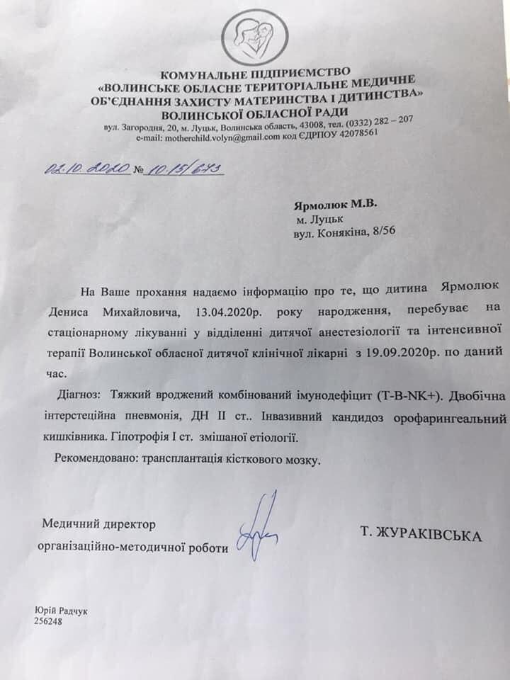 У 6-місячного Дениса після тривалих обстежень встановили діагноз «Тяжкий вроджений комбінований імунодефіцит», двобічна інтерстиціальна пневмонія, гіпотрофія 1 ст. змішаної етіології. З 19 вересня він перебуває на стаціонарному лікуванні у відділенні дитячої анестезіології та інтенсивної терапії Волинської обласної дитячої клінічної лікарні.