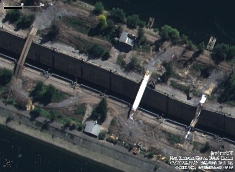 “На знімку від Airbus Pleiades Neo від 7 жовтня видно тимчасові мости через шлюзи Каховської ГЕС, встановлені російськими військами”, – пише аналітик OSINT (розвідка з відкритих джерел) Тім Ерхарт.