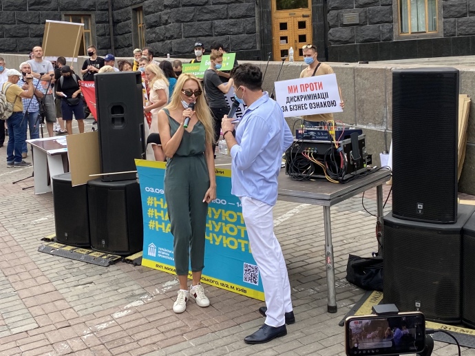 В руках у протестувальників плакати: “Нас не чують”, “Карайте винних, а не всіх підряд”, “Ми проти дискримінації”, “Кабмін, не порушуй конституцію”.
