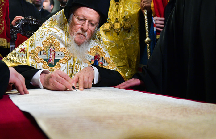 Таким чином, таке вирішене та розсуджене і в радості сповіщене вам від шанованого Центру Православ’я було соборно затверджено, для постійного збереження видається цей Патріарший і Синодальний Томос, написаний і підписаний в Кодексі нашої Великої Христової Константинопольської Церкви, вручений в точнiй і ідентичнiй копії Блаженнішому Предстоятелю Святішої Церкви України, кір Епіфанію та його високопревосходительству, Президенту країни пану Петру Порошенку, для вічного доказу та постійного представлення.