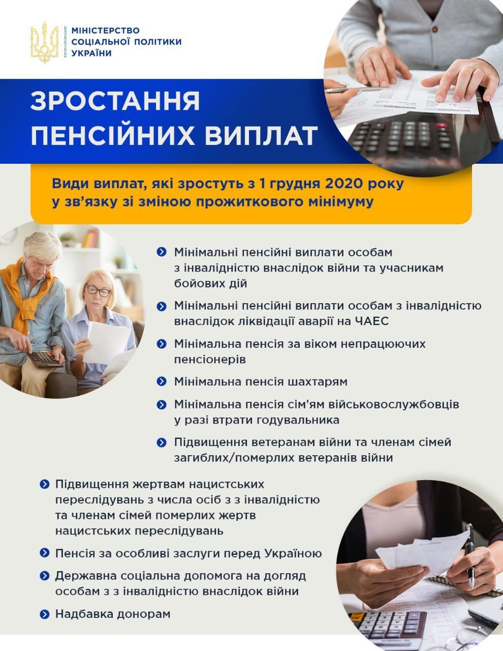 Сума виплат змінилася, зокрема для непрацюючих пенсіонерів, шахтарів, осіб з інвалідністю внаслідок ліквідації аварії на ЧАЕС, інвалідів внаслідок війни та учасників бойових дій, а також ветеранів війни, членів сімей загиблих ветеранів та деяких інших соціальних груп, повідомляє Міністерствоі соціальної політики України у Facebook 5 грудня.
