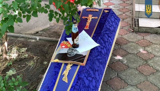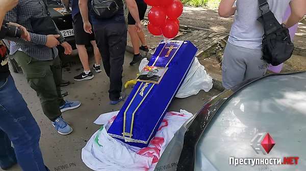 Коли занести труну в офіс не вдалося, учасники акції залишили її біля входу і розійшлися.