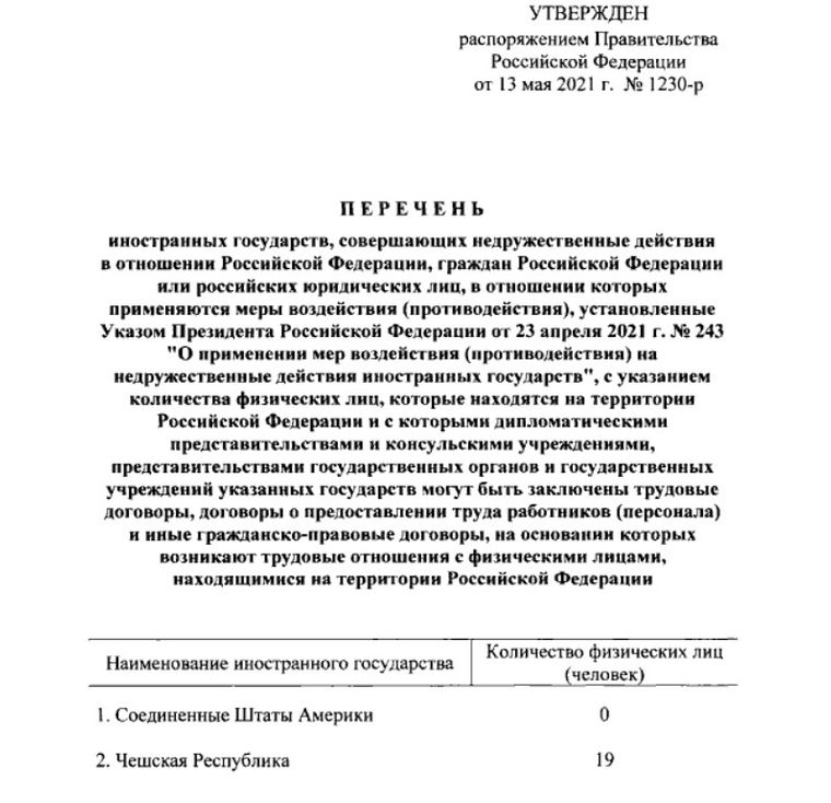 З розпорядження уряду слідує, що посольству Чехії дозволили взяти на роботу 19 людей, які перебувають у Росії. А ось посольству США не можна наймати на роботу нікого з Росії.