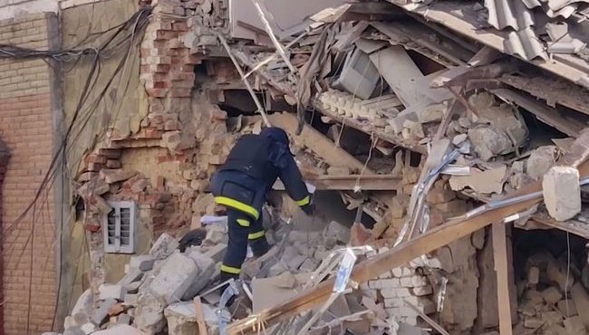Рятувальники Державної служби з надзвичайних ситуацій України намагаються розрізати двері, щоб допомогти людям евакуюватися з будівель і отримати медичну допомогу.