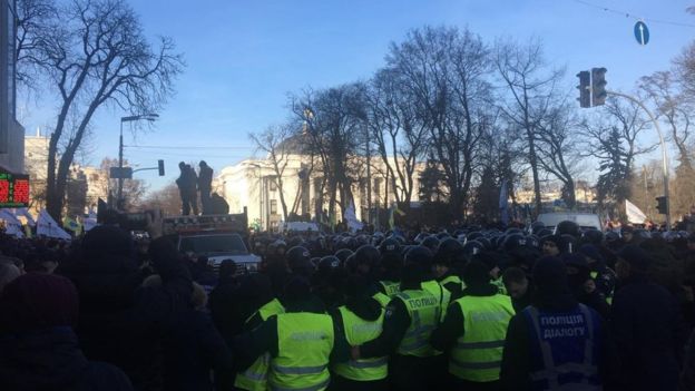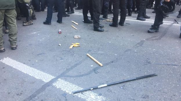 Кількох правоохоронців, повідомляє кореспондент BBC, облили зеленкою. Попри це поліція поки нікого не затримала.