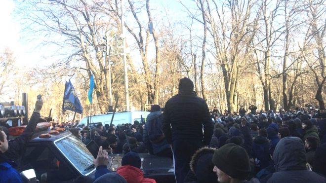Як повідомляє кореспондент BBC News Україна, на мітингу є представники “Батьківщини”, “Свободи” і Нацкорпусу.