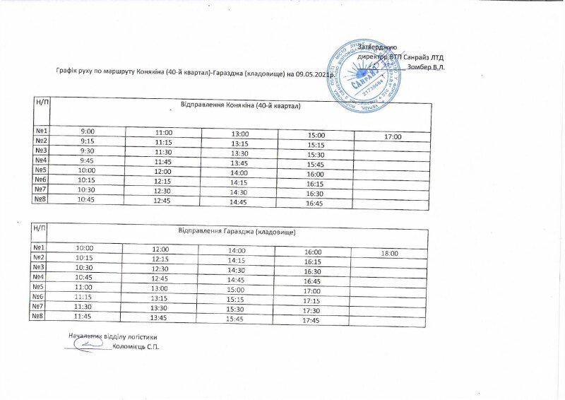 Також на сайті міськради оприлюднили графік руху автобусів, що будуть здійснювати перевезення пасажирів у Провідну неділю (09.05.2021) до кладовища у Гаразджі за маршрутом «Конякіна (40-й квартал) – Гаразджа» (Конякіна, Гордіюк, Соборності, Молоді, Відродження, Рівненська, с.Гаразджа).