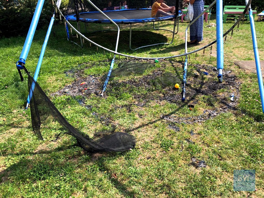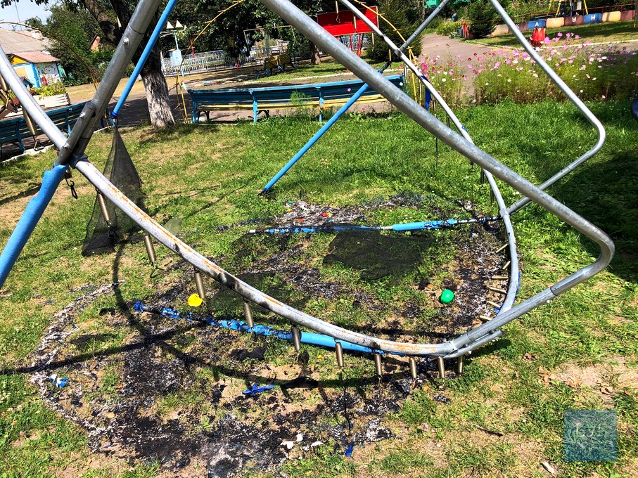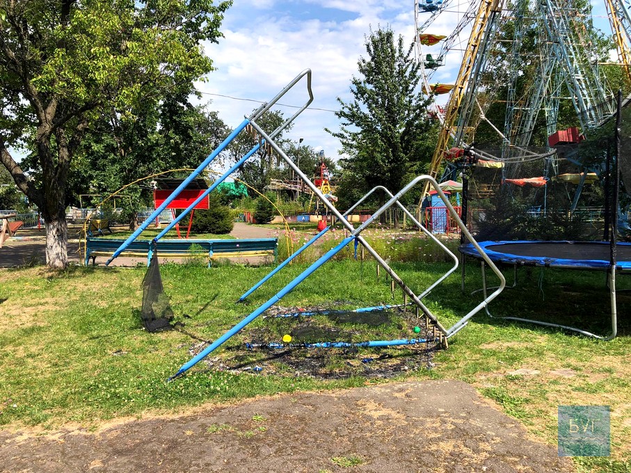 Вандали зламали огорожу атракціону «Веселі гірки» та в зоні відпочинку спалили батут. Від нього залишився лише каркас. Роман додав, що батут – не власність парку, його придбали спонсори.