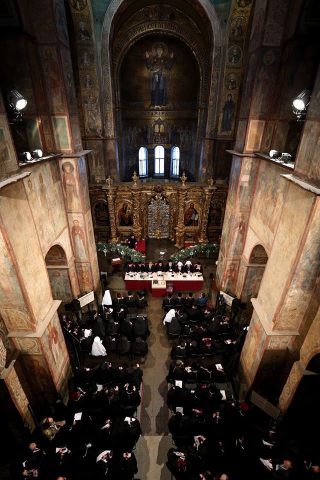 Речник президента України Святослав Цеголко опублікував фото. У президії Собору сидять глава української держави Петро Порошенко, патріарх Української церкви Київського патріархату Філарет. Посередині – екзарх Вселенського патріархату Еммануїл Галльський.
