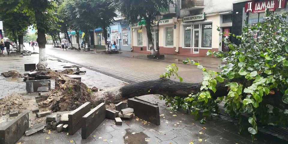 Під час зливи у центрі Луцька, на пішохідній вулиці Лесі Українки, вивернуло з корінням липу. Там саме обрізали коріння деревам, – пише Волинь24.