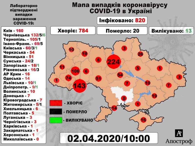 У четвер, 2 квітня, в Україні зафіксовано 820 випадків зараження на коронавірус COVID-19, критичною є ситуація в Київській та Чернівецькій області – 224 і 143 випадків відповідно. Про це повідомляє Апостроф.