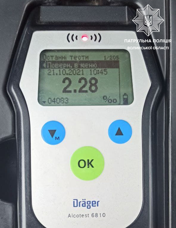 Під час спілкування з керманичем, патрульні виявили в нього ознаки алкогольного сп’яніння. У присутності свідків, чоловік пройшов огляд на визначення стану алкогольного сп’яніння. Результат – 2,28 проміле, що в 11 разів перевищує допустиму норму.