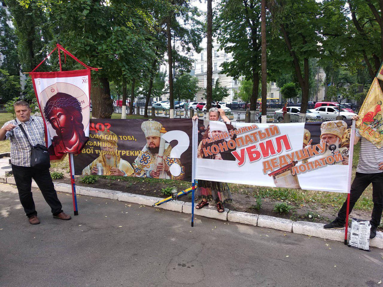 Під стінами храму зібралося кілька протестуючих на чолі з Валентином Лук’яником – головою Спілки православних братств (УПЦ МП).