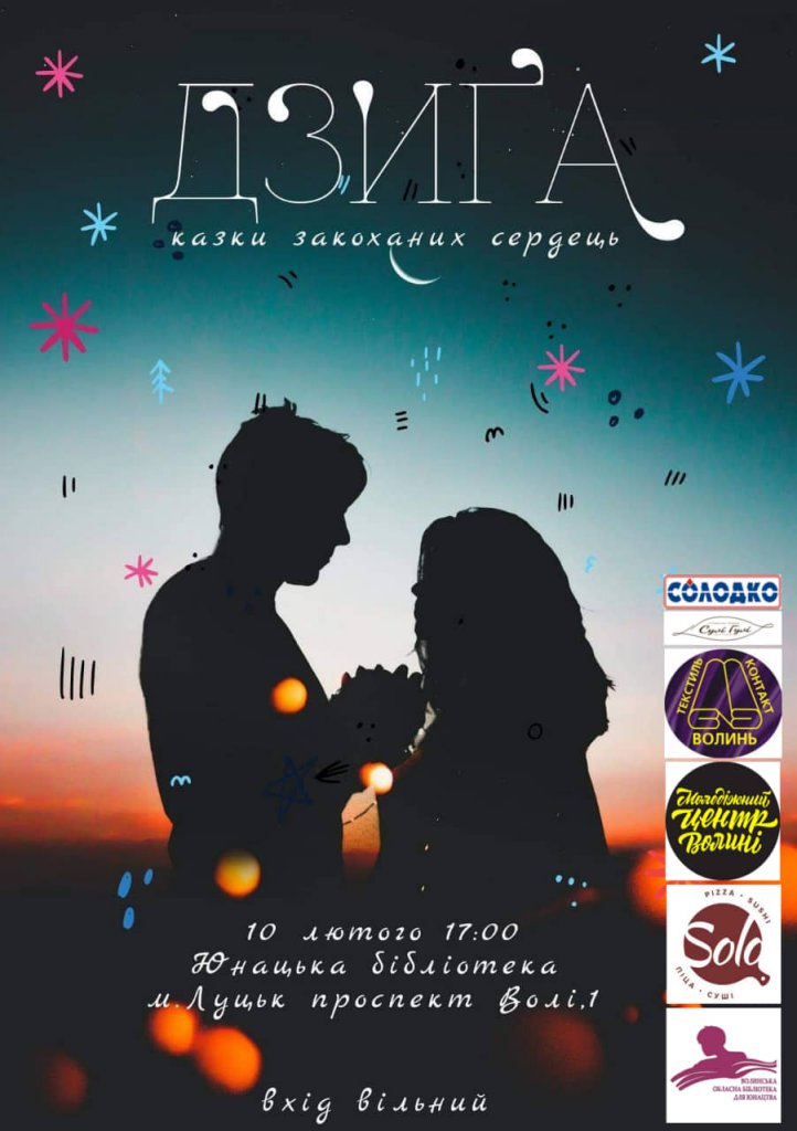 У Волинській обласній бібліотеці для юнацтва (проспект Волі, 2) 10 лютого о 17:00-19:00 відбудеться літературно-акустичний вечір «Дзиґа». Головний настрій вечора – романтика, тема – «казки закоханих сердець».