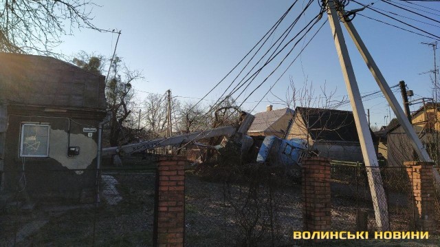 Автокран впав на паркан та пошкодив лінію електропередач. Як зазначають місцеві мешканці, весь район залишився без світла.