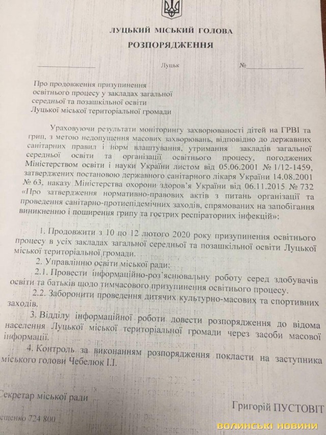 У всіх закладах загальної середньої та позашкільної освіти у Луцьку призупинили освітній процес з 10 по 12 лютого. Про це йдеться у відповідному розпорядженні виконувача повноважень Луцького міського голови Григорія Пустовіта, що сьогодні, 6 лютого, надійшло на адреси луцьких шкіл, – пише ІА Волинські Новини.