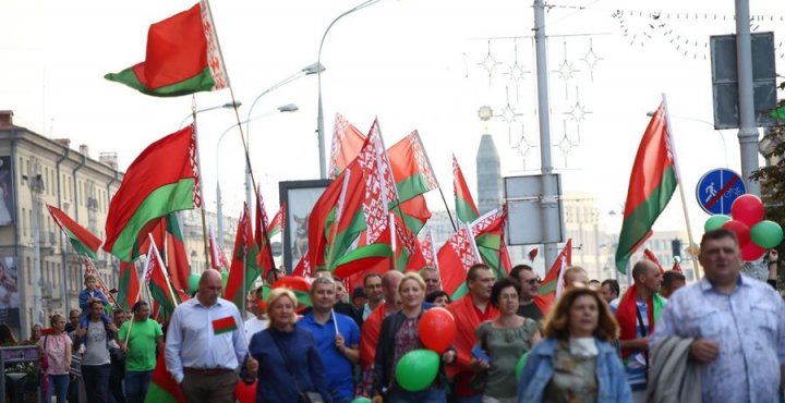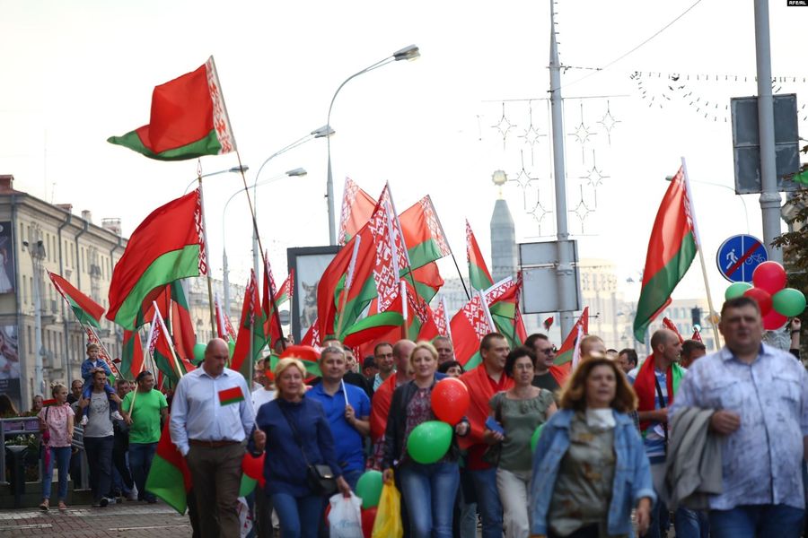 Одночасно на проспекті Незалежності рухається колона прихильників Олексанра Лукашенка з чинними державними прапорами.