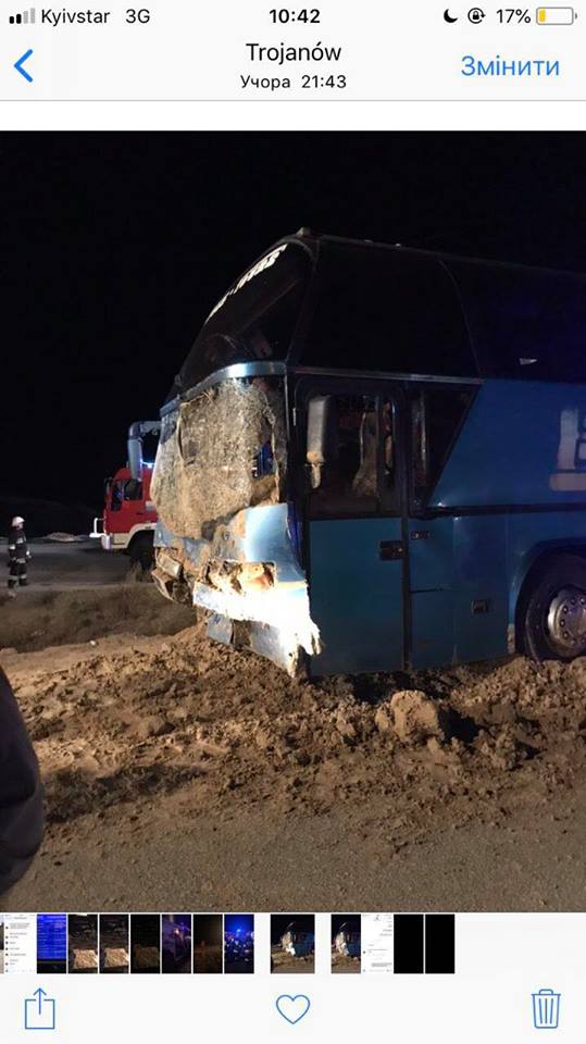 За її словами, 20 українських пасажирів о 19:10 виїхали автобусов з Варшави і направлялися до Коломиї (Івано-Франківська область). Аварія сталася о 22 годині в населеному пункті Троянів.
