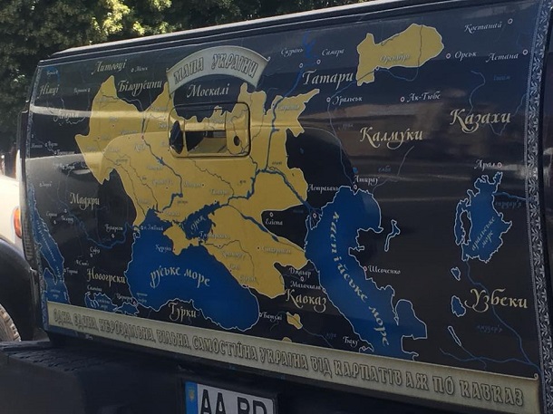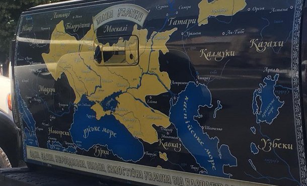 На знімках можна побачити машину, на якій зображено незвичайну карту України, де частина території Росії входить до складу української держави.