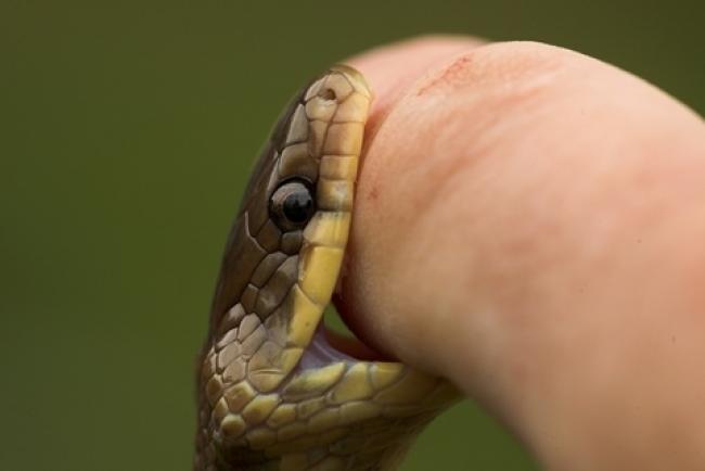Чоловік розповів, що, коли працював, розв’язалася шнурівка, нагнувся її зав’язати і побачив, що щось на землі крутиться. Він простягнув руку – змія вкусила за палець.