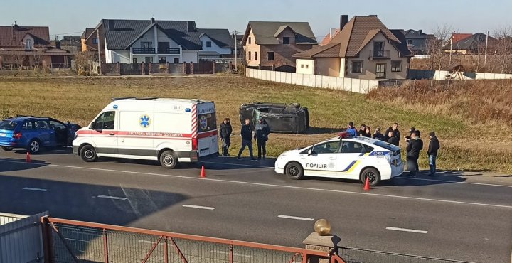 Один з автомобілів відкинуло з дороги й він перекинувся на бік.